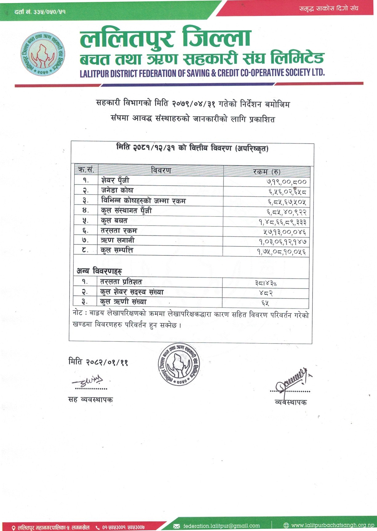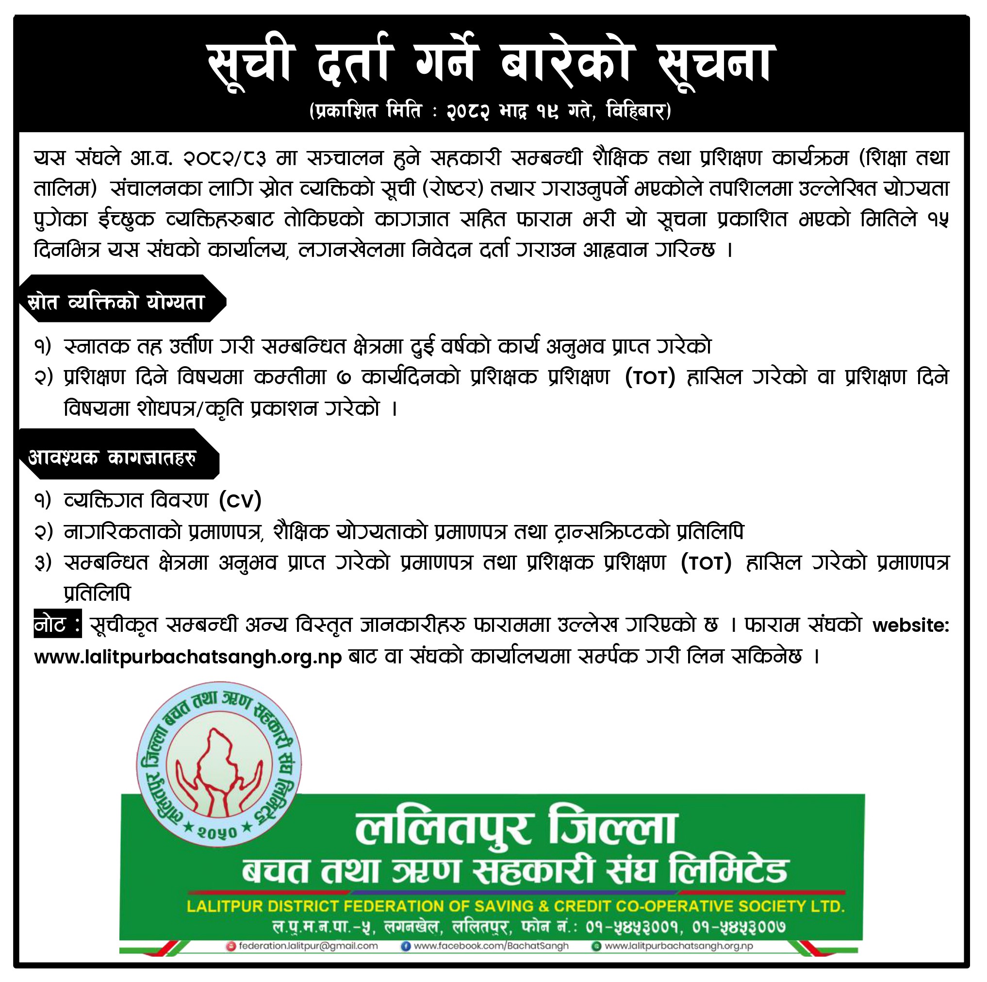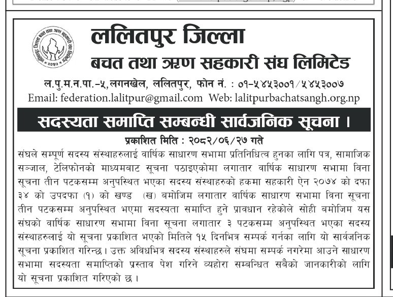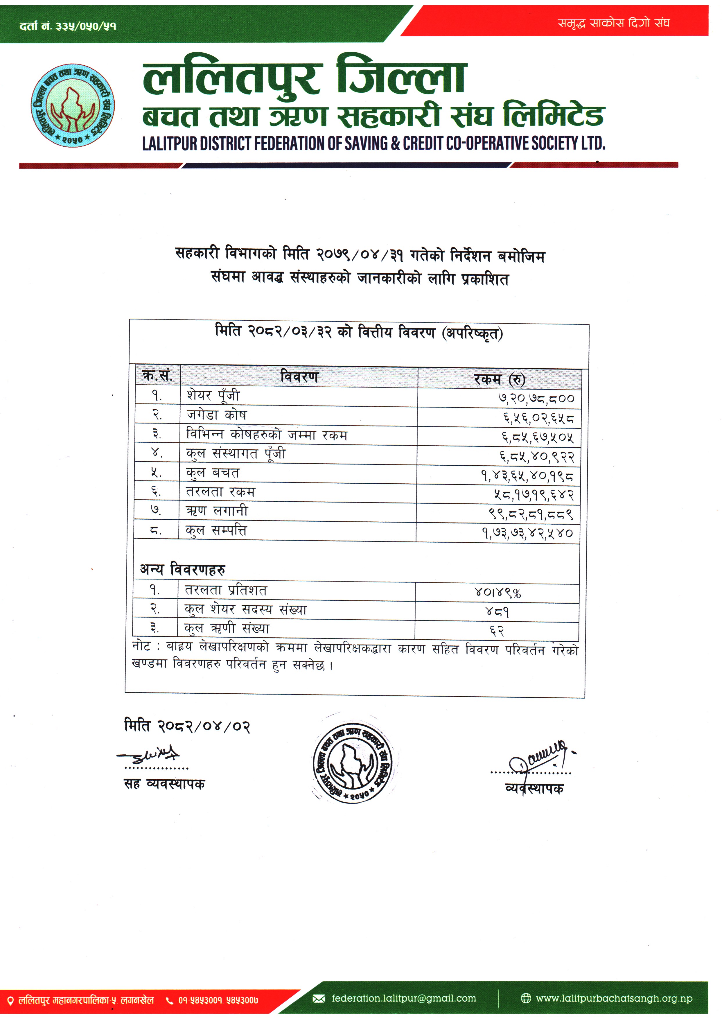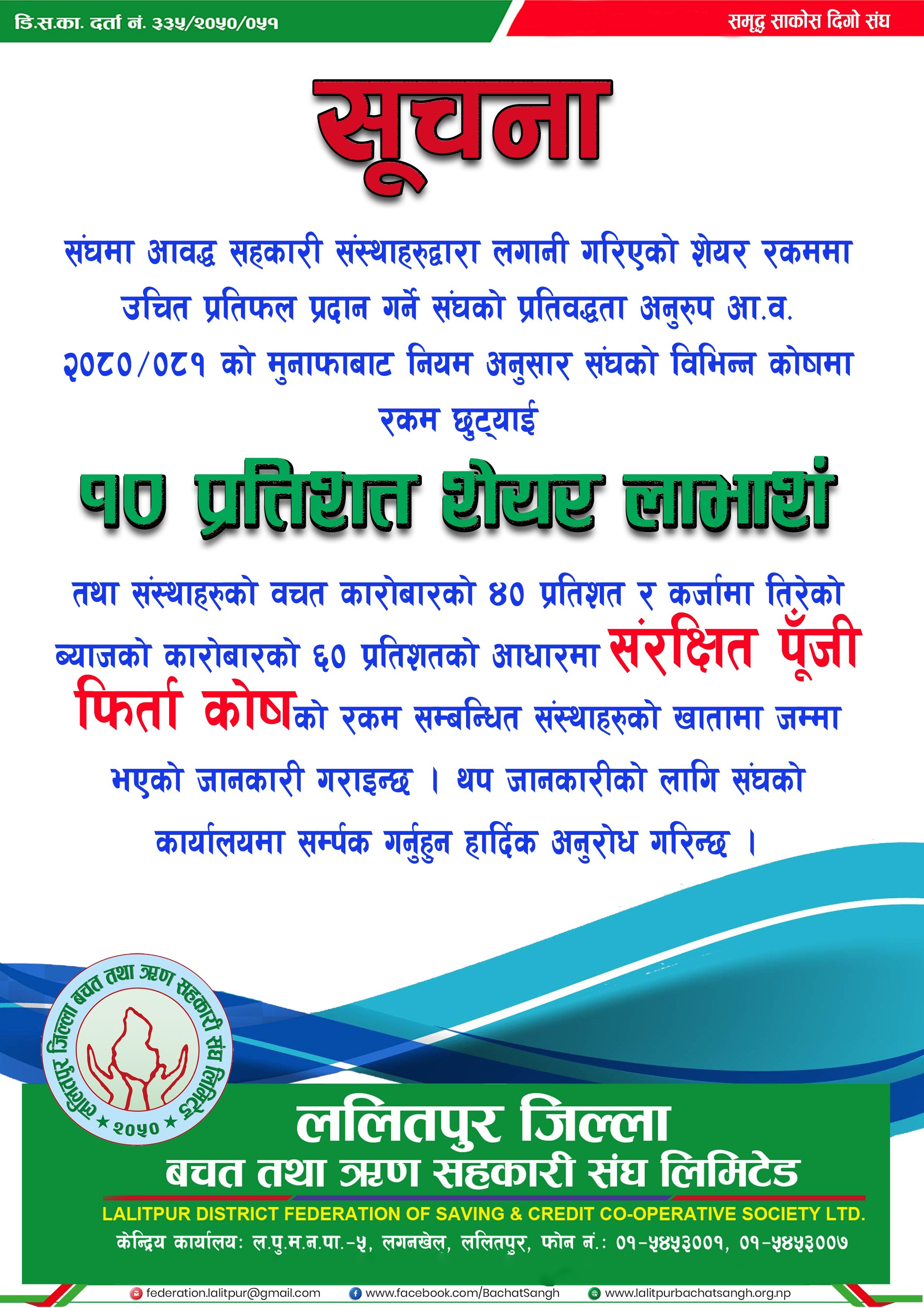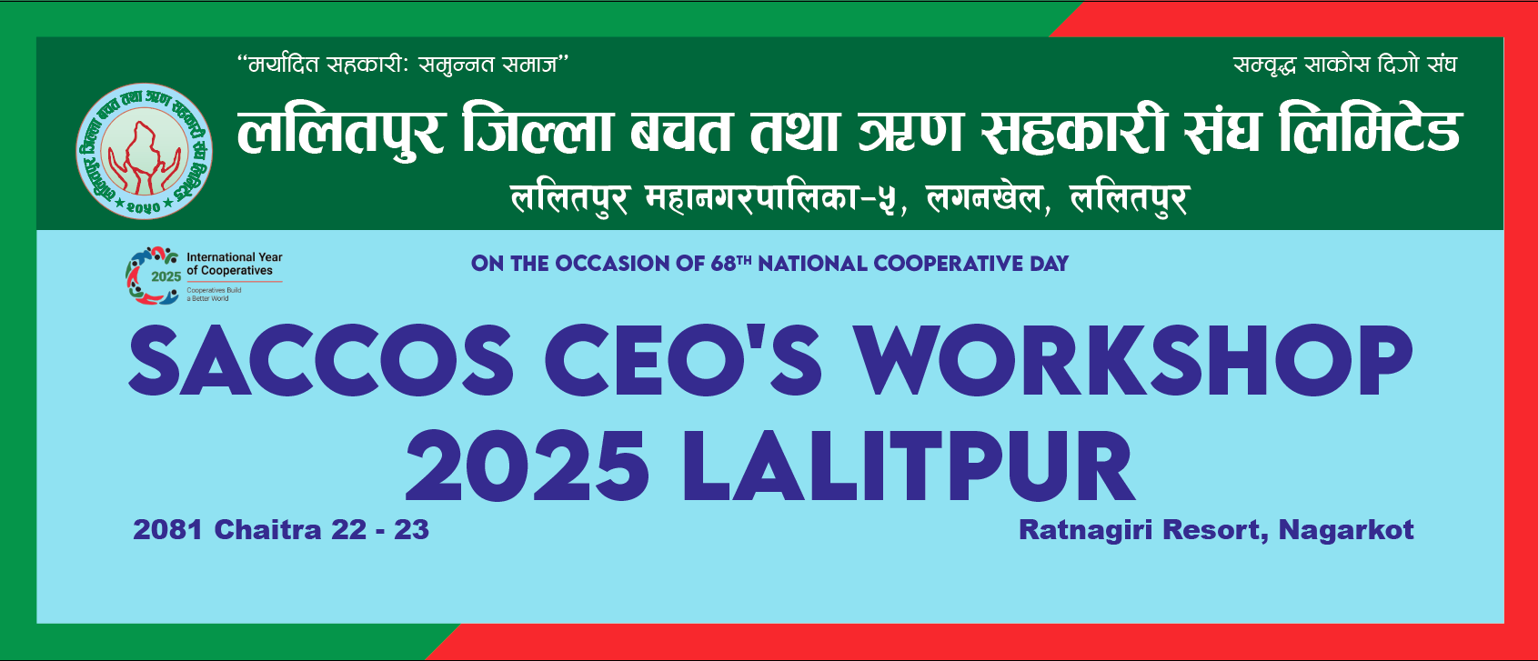 ललितपुर जिल्ला बचत तथा ऋण सहकारी संघ लि. सहकारी ऐन २०४८ बमोजिम मिति २०५० साल असोज ३ गते स्थापना भएको ललितपुर जिल्लाका बचत तथा ऋण सहकारी संस्थाहरुकोे जिल्ला स्तरिय छाता संगठन हो । यस संघमा ५२६ वटा प्रारम्भिक संस्थाहरु आवद्ध भैसकेका छन् । स्थापनाकाल देखि नै यस संघले सदस्य संस्थाहरुको विकास र प्रवर्धनका लागि विभिन्न प्रकारका सेवाहरु जस्तै तालिम, शिक्षा, गोष्ठि, अन्तरलगानी लगायतका कार्यक्रमहरु संचालन गर्दै आईरहेको छ । ललितपुर जिल्लामा दर्ता भएका ५६९ बचत तथा ऋण सहकारी संस्थामध्ये हाल संघमा महिलाबाट सञ्चालित सहकारी संस्था ३९ र अन्य बचत तथा ऋण सहकारी संस्था ४८७ गरि कुल ५२६ बचत ऋण सहकारी संस्था संघमा आवद् भईसकेक...