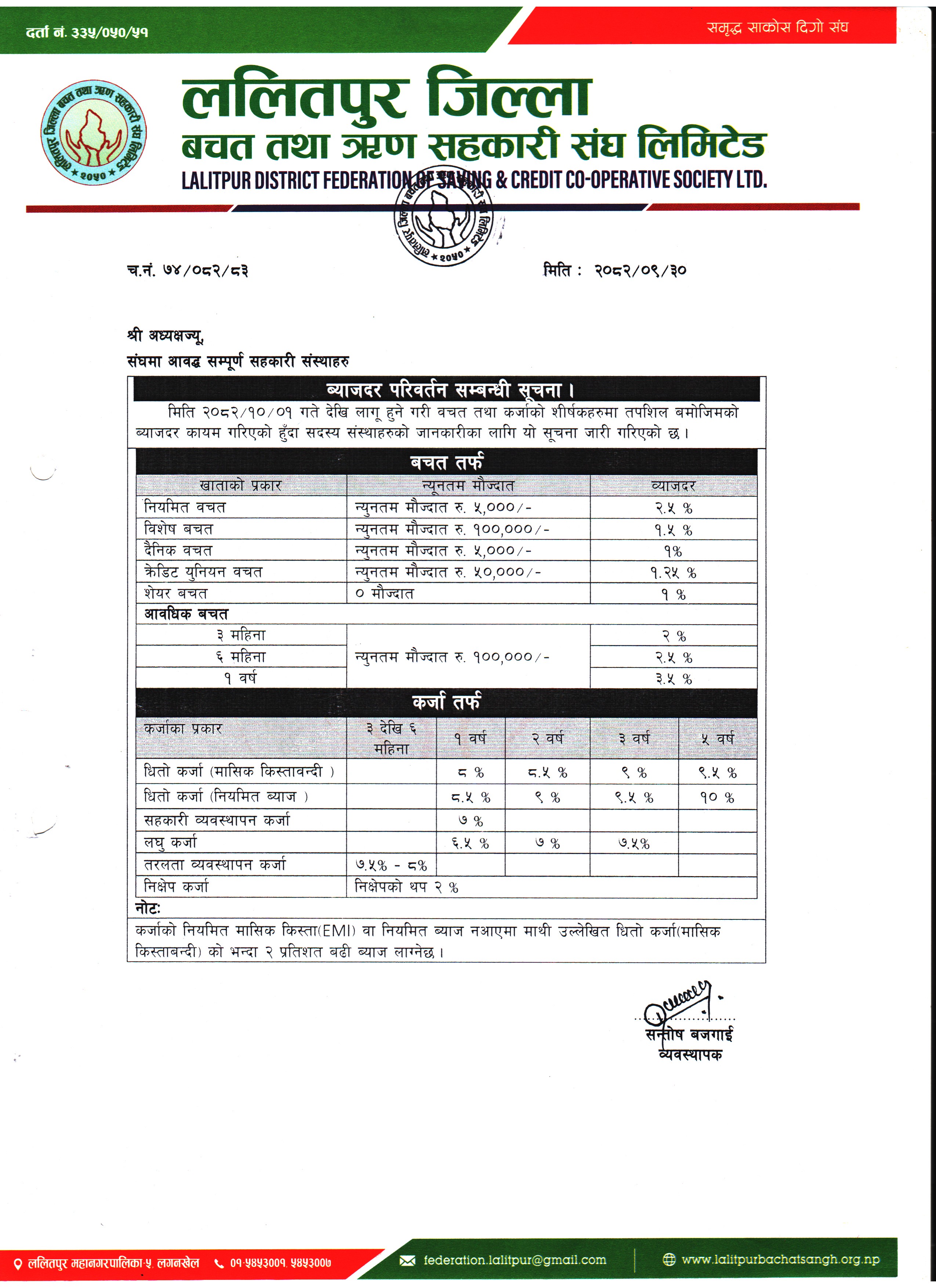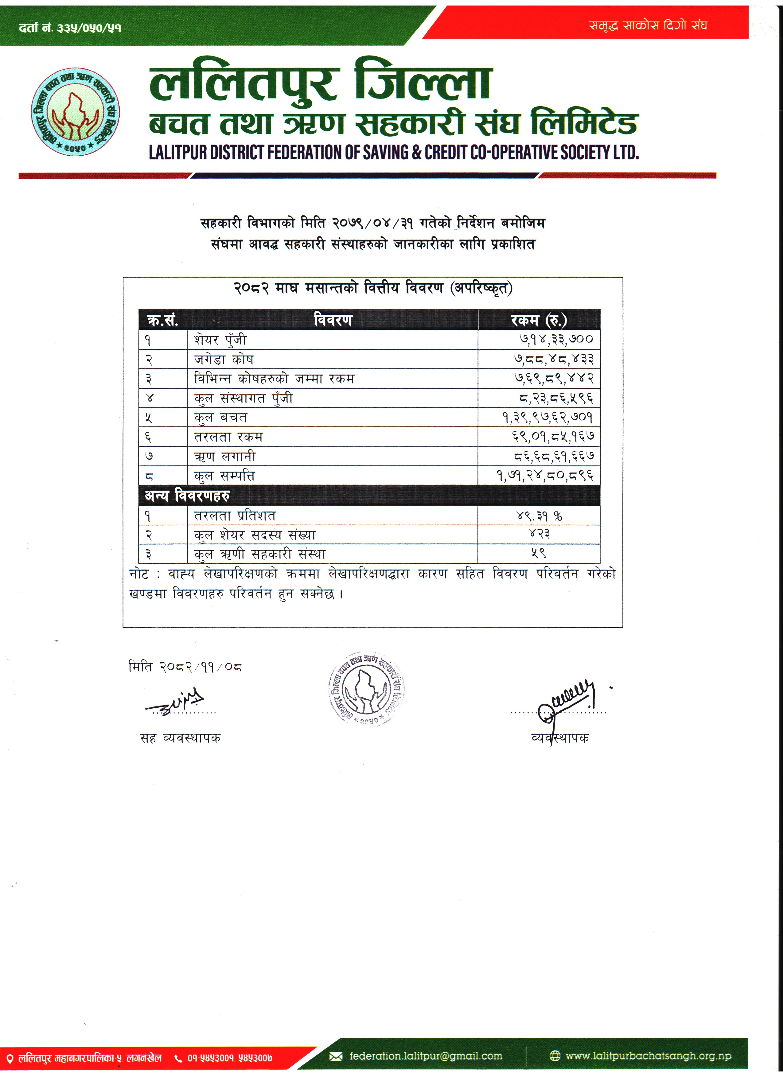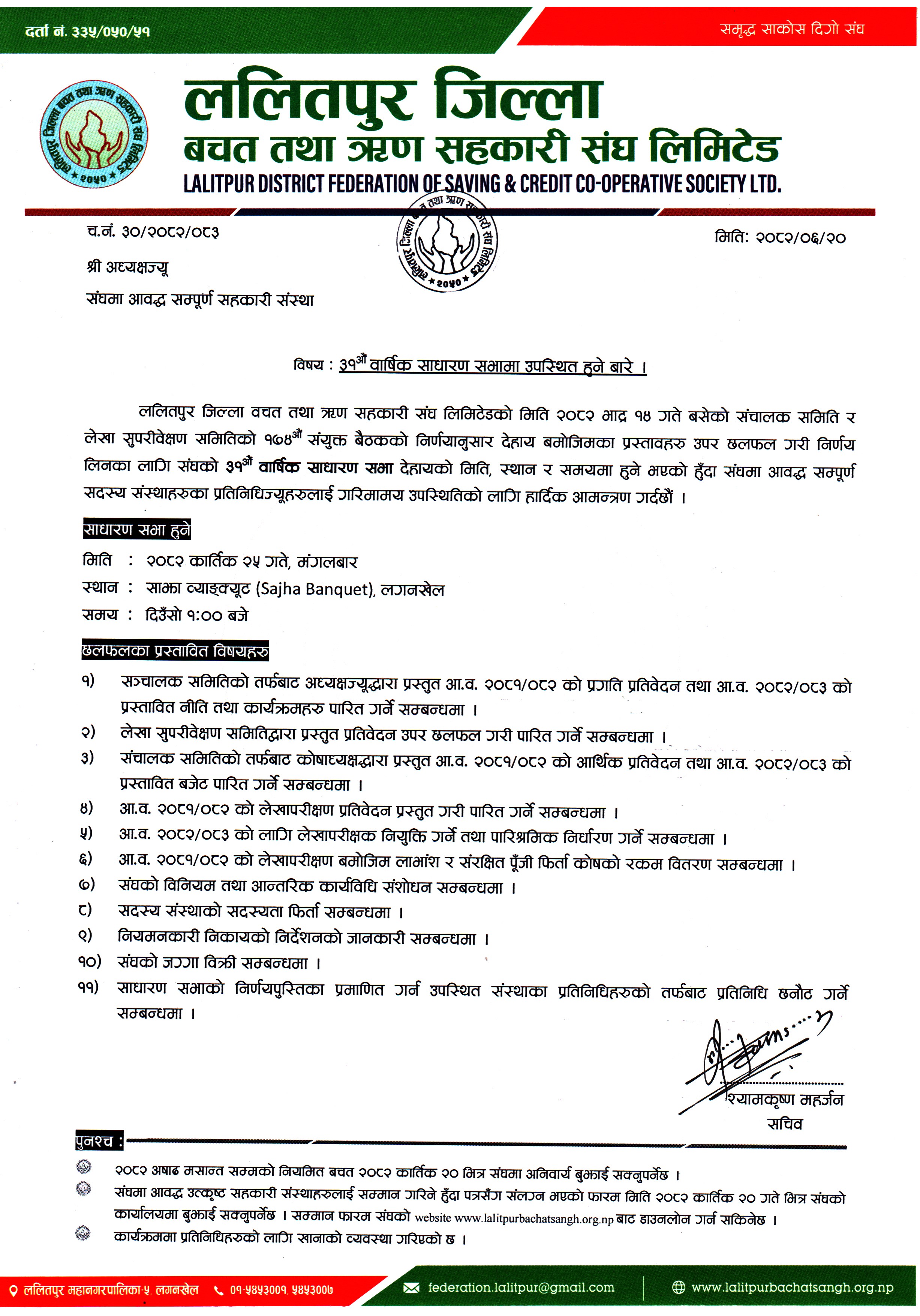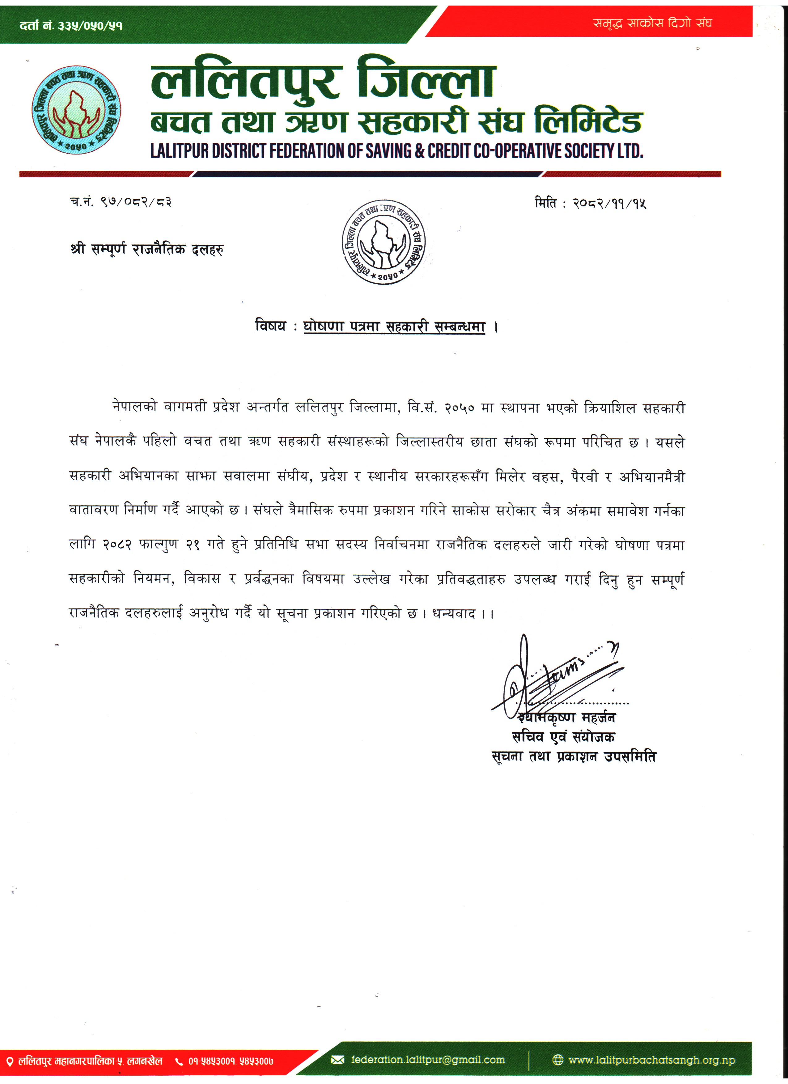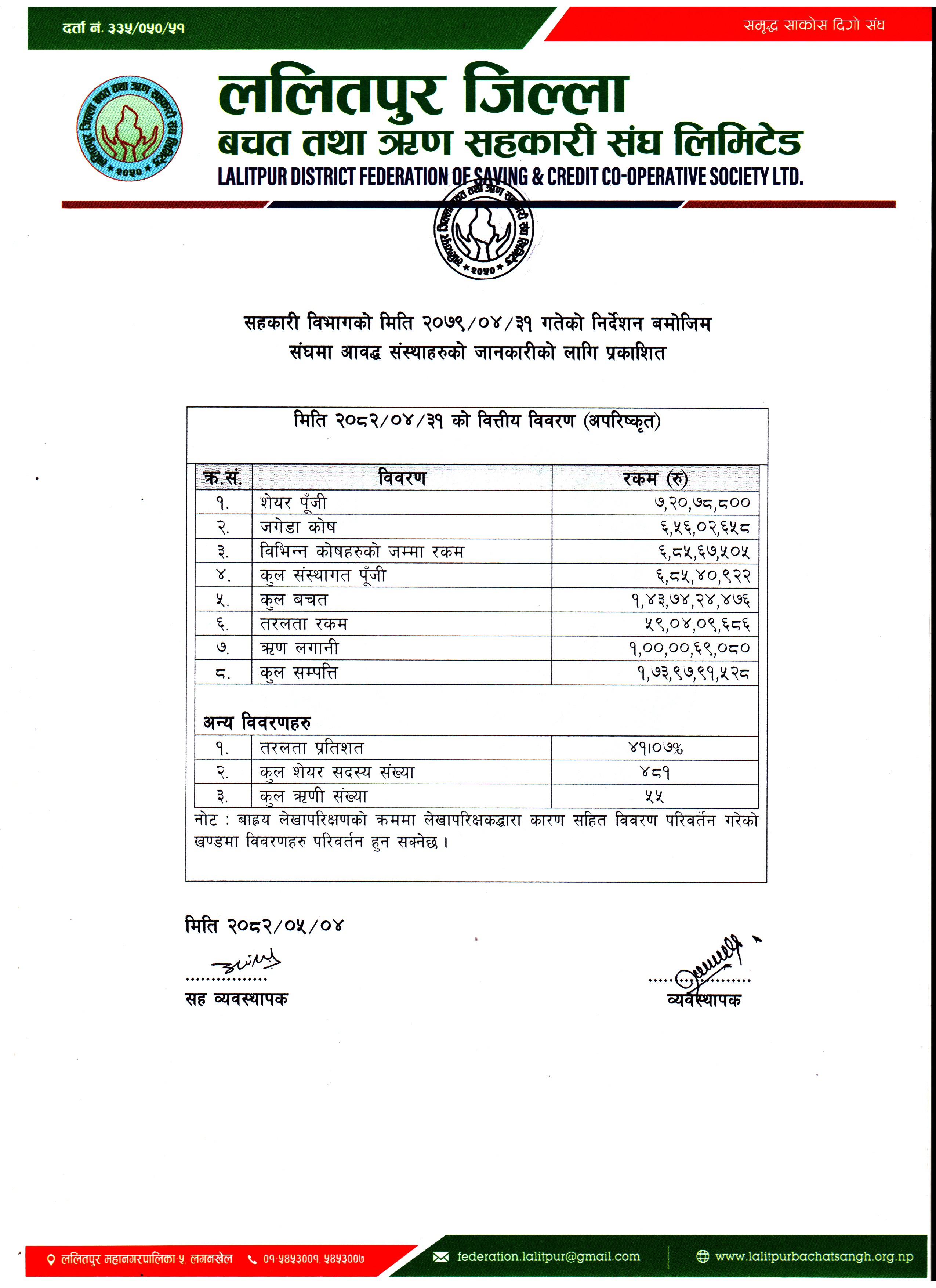 ललितपुर जिल्ला बचत तथा ऋण सहकारी संघ लि. सहकारी ऐन २०४८ बमोजिम मिति २०५० साल असोज ३ गते स्थापना भएको ललितपुर जिल्लाका बचत तथा ऋण सहकारी संस्थाहरुकोे जिल्ला स्तरिय छाता संगठन हो । यस संघमा ५२६ वटा प्रारम्भिक संस्थाहरु आवद्ध भैसकेका छन् । स्थापनाकाल देखि नै यस संघले सदस्य संस्थाहरुको विकास र प्रवर्धनका लागि विभिन्न प्रकारका सेवाहरु जस्तै तालिम, शिक्षा, गोष्ठि, अन्तरलगानी लगायतका कार्यक्रमहरु संचालन गर्दै आईरहेको छ । ललितपुर जिल्लामा दर्ता भएका ५६९ बचत तथा ऋण सहकारी संस्थामध्ये हाल संघमा महिलाबाट सञ्चालित सहकारी संस्था ३९ र अन्य बचत तथा ऋण सहकारी संस्था ४८७ गरि कुल ५२६ बचत ऋण सहकारी संस्था संघमा आवद् भईसकेक...